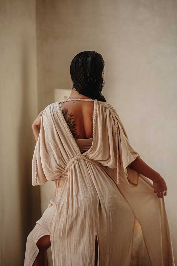 Detalle de trenzado en la espalda que añade un toque de sofisticación y originalidad.