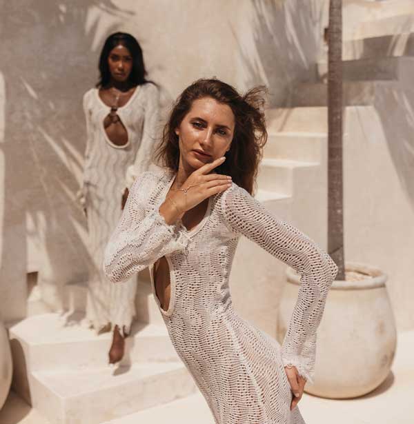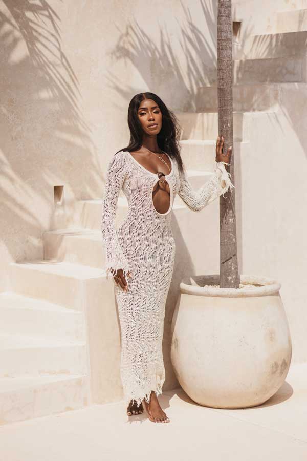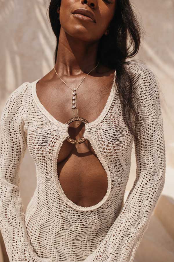 El vestido Aflora es una elegante obra maestra de encaje hecho a mano, adornado con un hermoso escote acompañado de un aro de coco en el centro y mangas largas. Su dobladillo acampanado con flecos naturales de la tela, brinda un movimiento fluido y encantador. Con “Aflora”, celebras tu propia esencia y belleza única, floreciendo con cada movimiento.